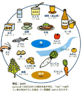フッ素とは、私たちの身近な自然界にある元素のひとつで、お茶や魚介類などに多く含まれています。