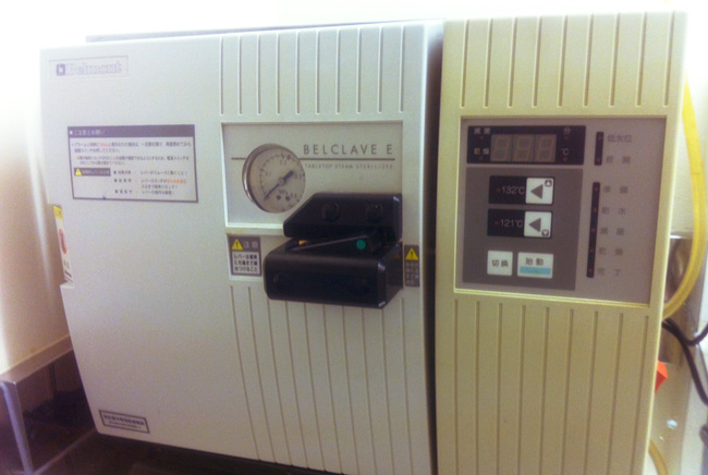 今までも大型の滅菌機で患者さま毎に滅菌交換しておりましたが、この機器の導入により、今まで1時間かかっていた滅菌が15分で出来るので、より効率よく診療ができるようになりました。